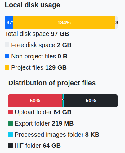 There is a minor issue if the IIIF path points to the files/uploads path. If this happens, the upload folder and IIIF folder is counted separately. This will sum up to larger project files and breaks the file statistic like in Thanados (see image).