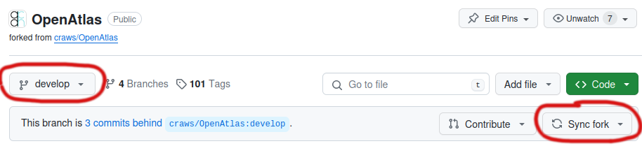 - Update the online develop branch in your GitHub fork. You can do this with the Sync fork button after switching to develop (see screenshot below).